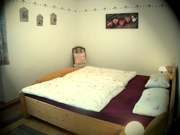 Ein Schlafzimmer mit Doppelbett. Zustellbett oder Kinderbett sind möglich.