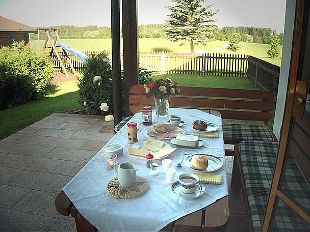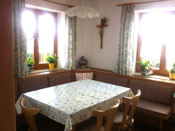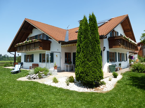 Auf 80 m² eine großzügige Ferienwohnung, ebenerdig, mit eigenem Eingang. Südterrasse mit herrlichem freiem Blick auf die Allgäuer, Oberbayerischen und Tiroler Alpen.