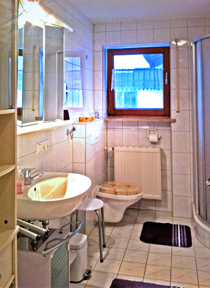 Bad mit WC, Dusche und Badewanne.